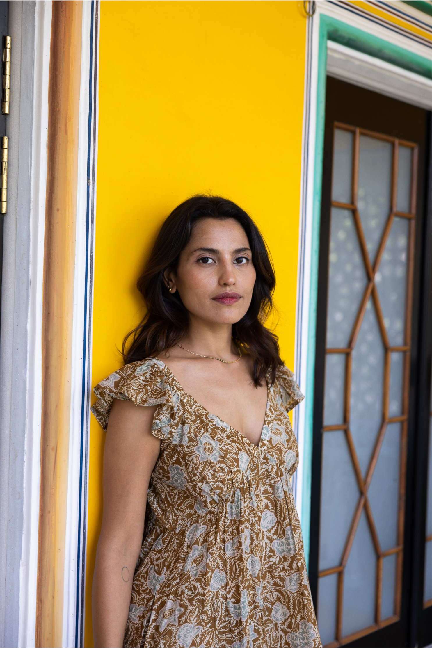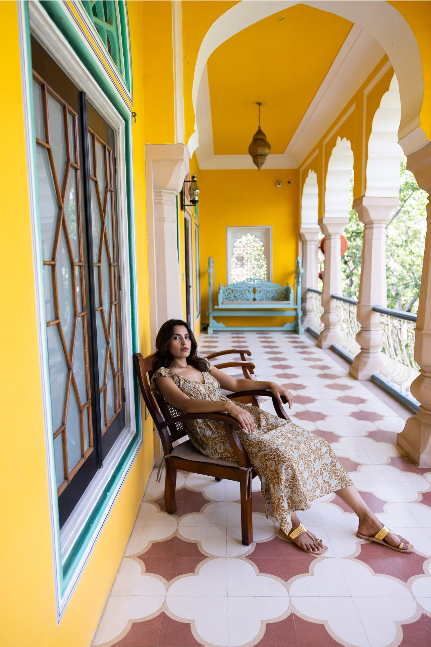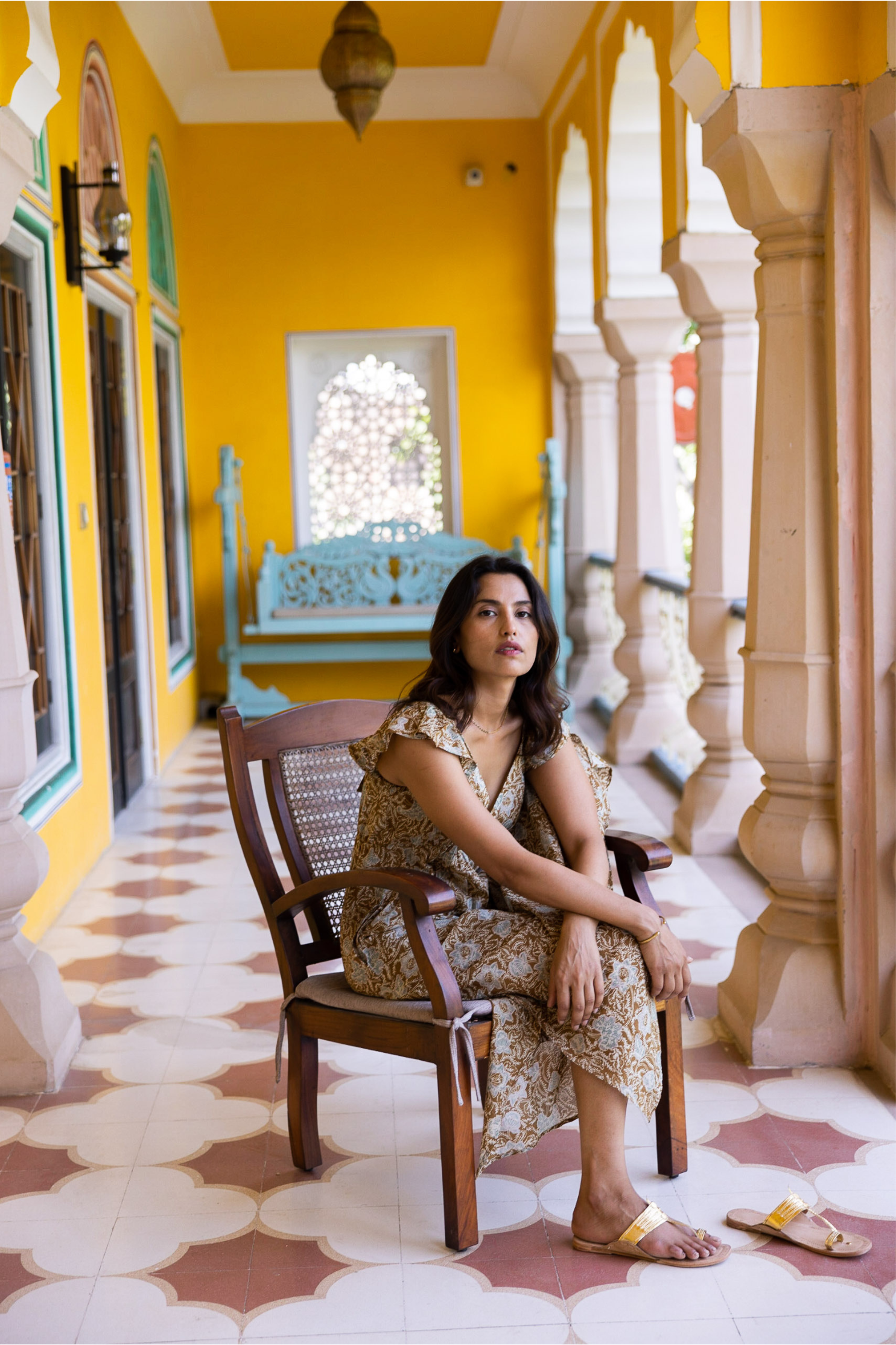 V-neck midi dress in silk and cotton vintage Batik print. Ruffle sleeve detail with button-adjustable shoulder straps at the back, and side pockets. Ethically made in India with love.