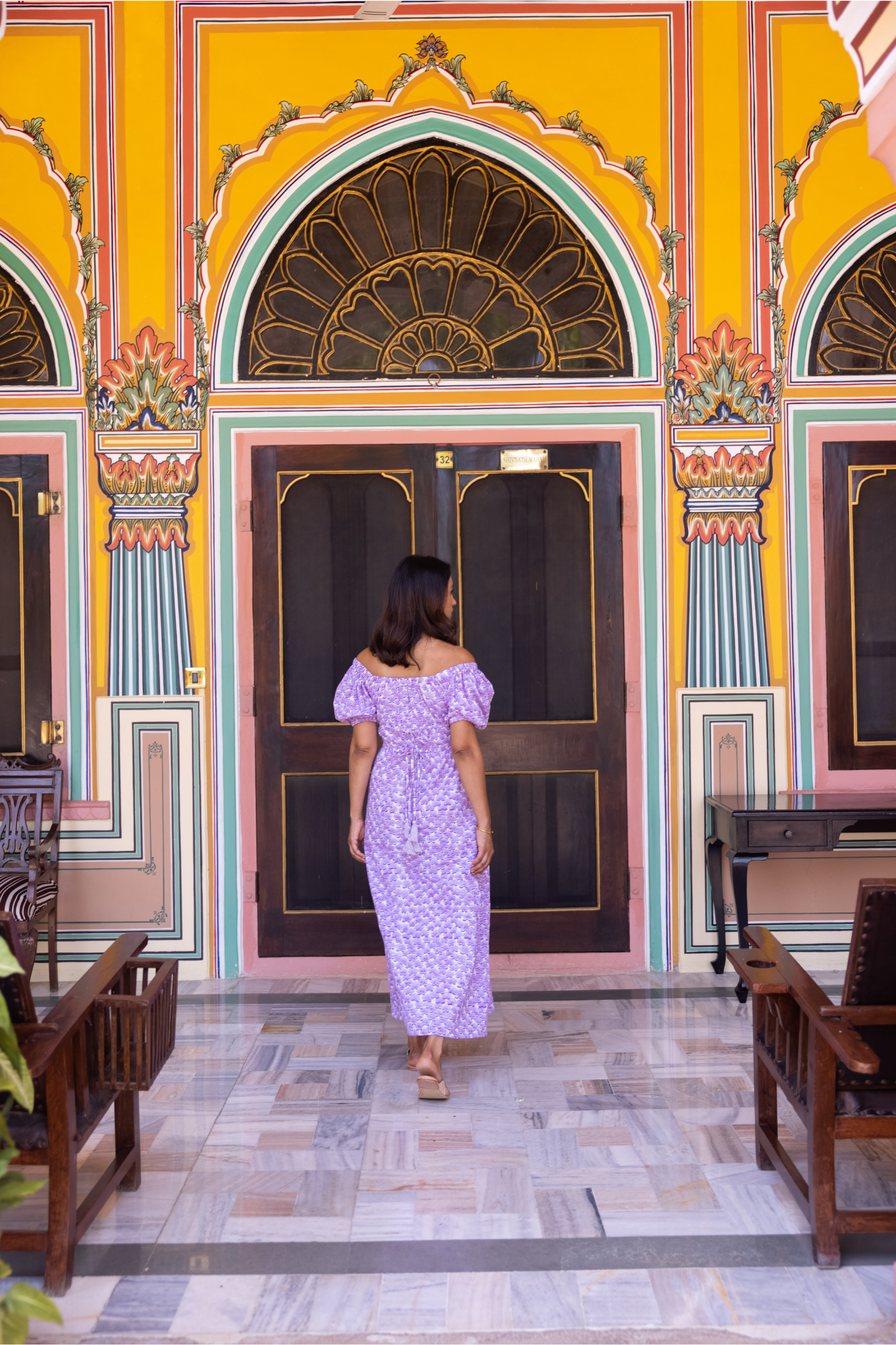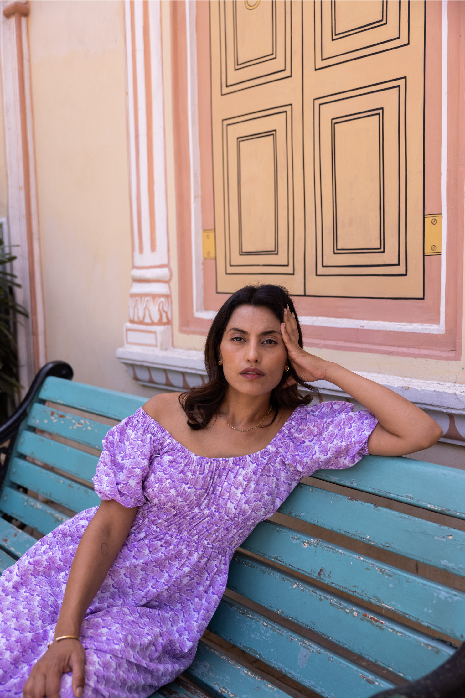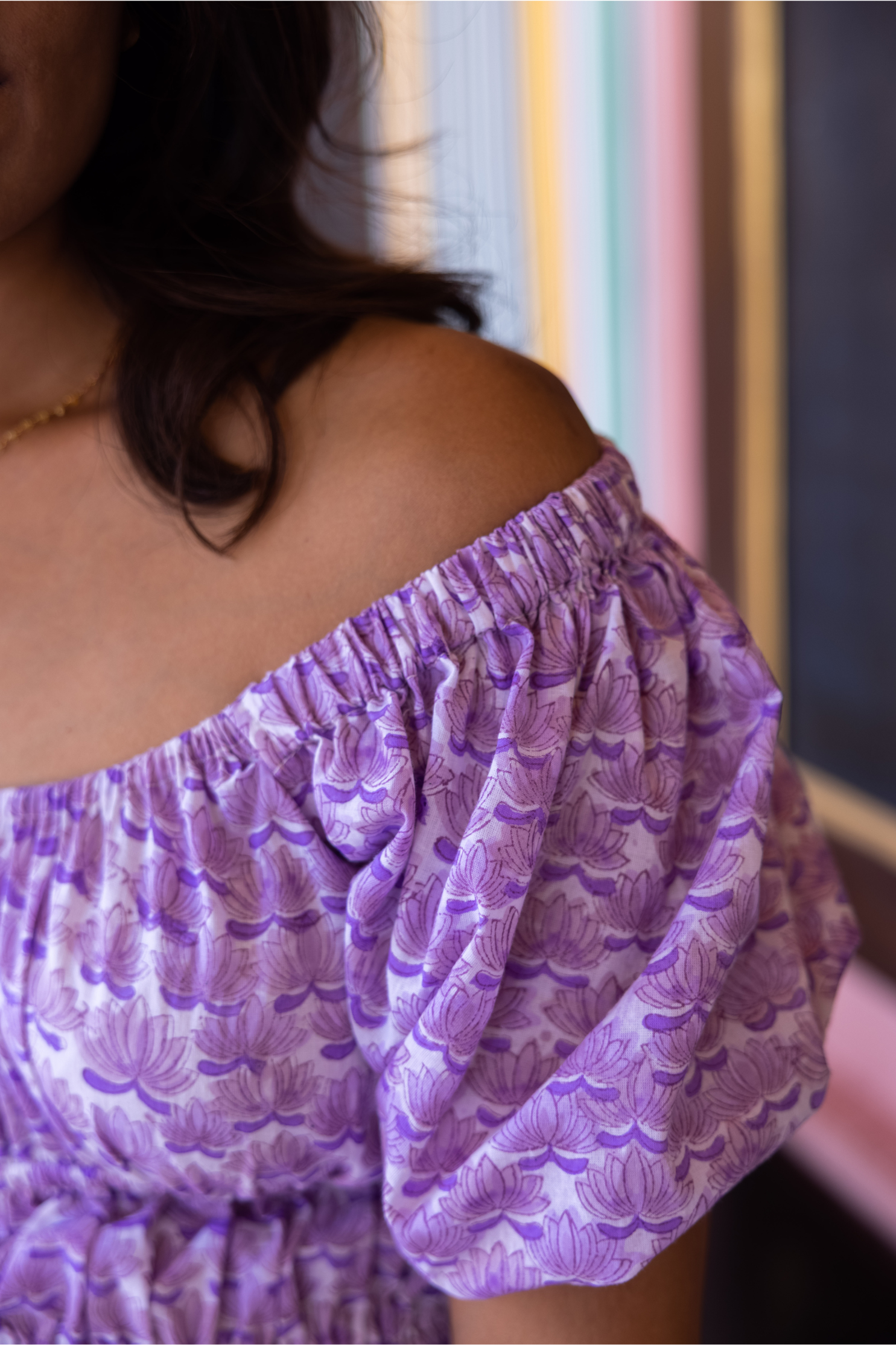 Hand block-printed midi dress. Elasticated puffed sleeve that can be worn on or off the shoulder. Adjustable back ties with tassel detail. Ethically made in India with love.