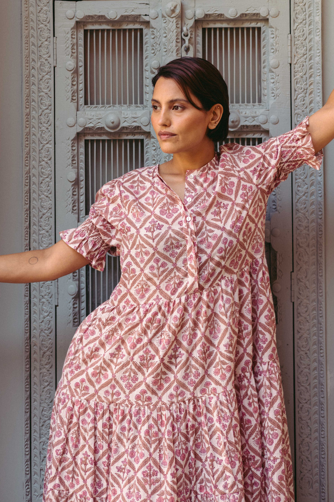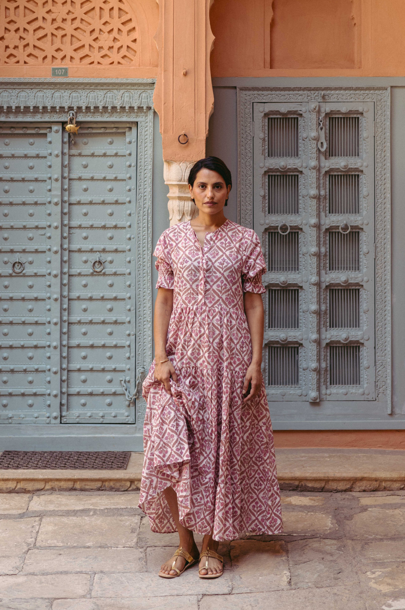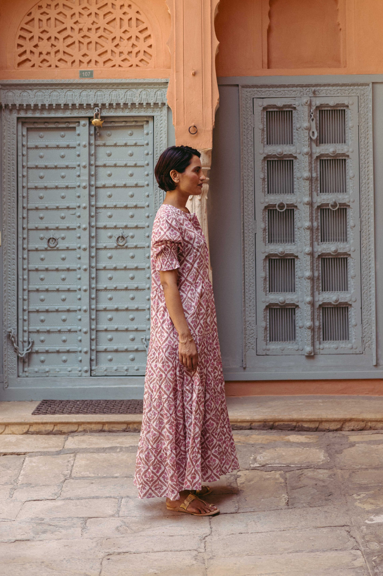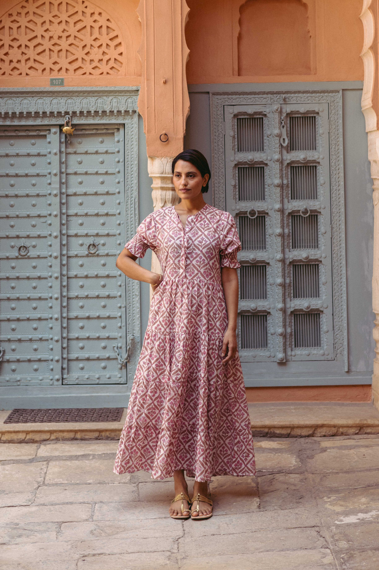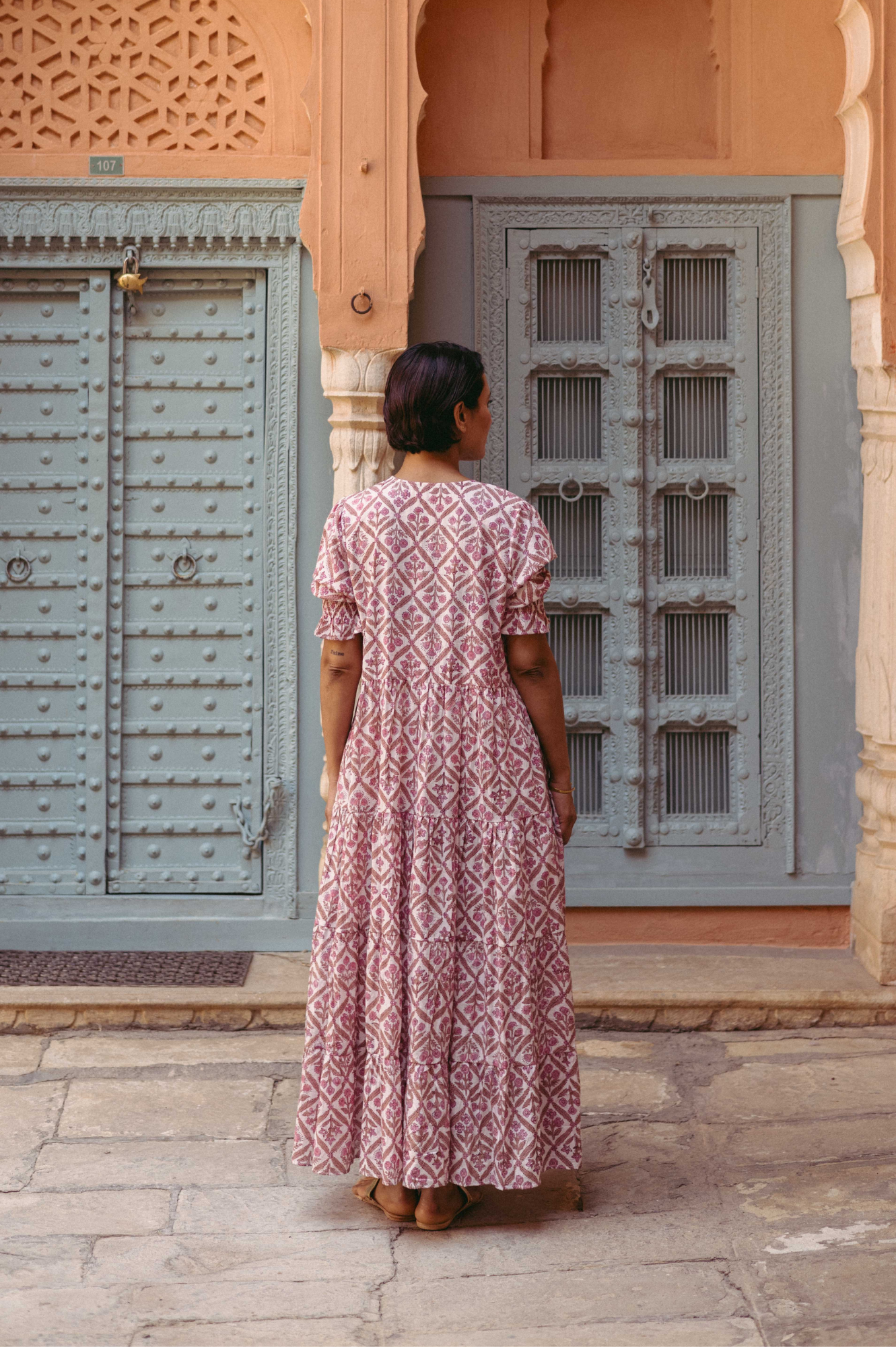 Beautiful hand block-printed cotton tiered maxi dress with button through bodice. Slightly puff sleeve with shirred cuff detail. Ethically made in India with love.