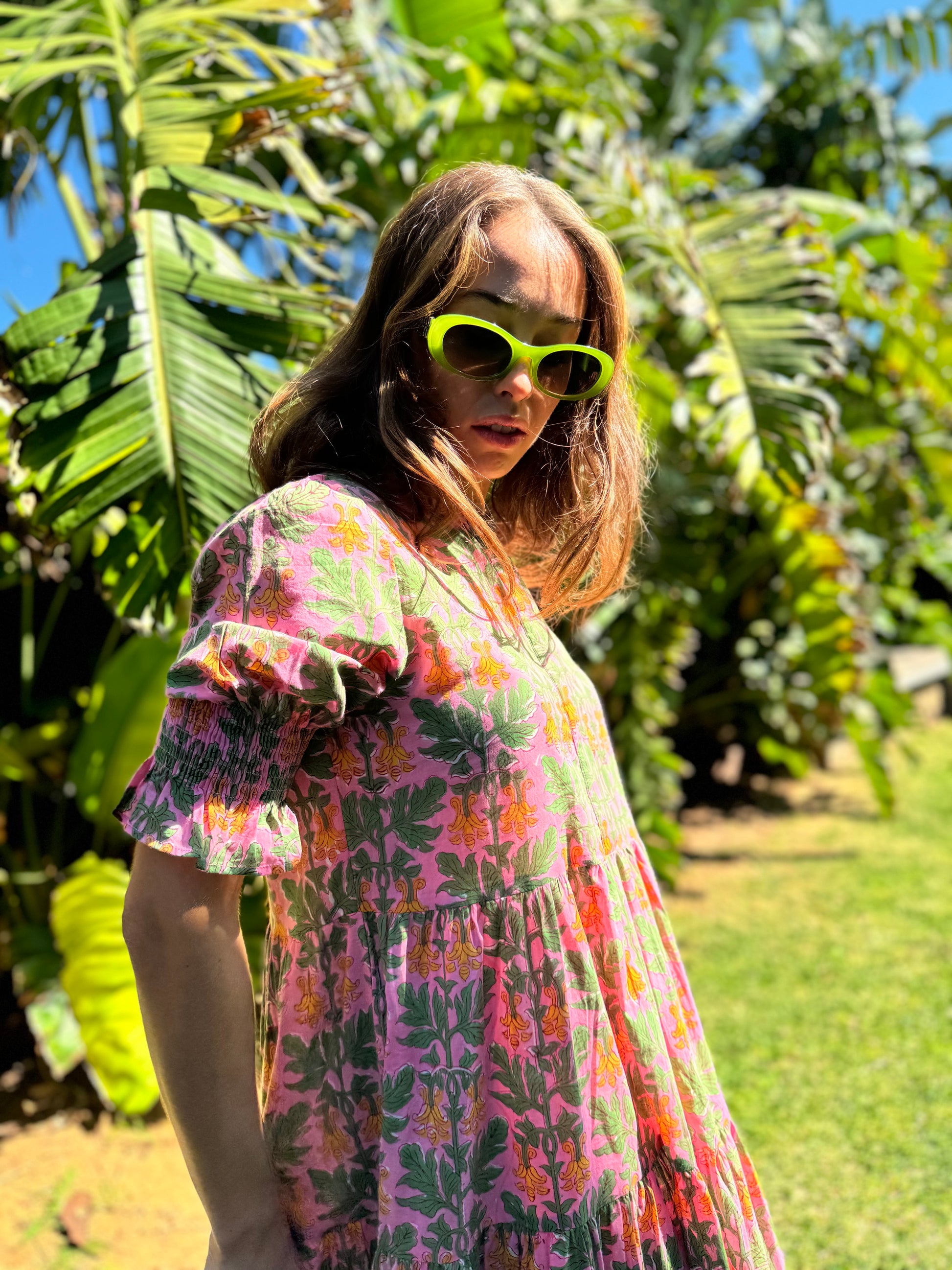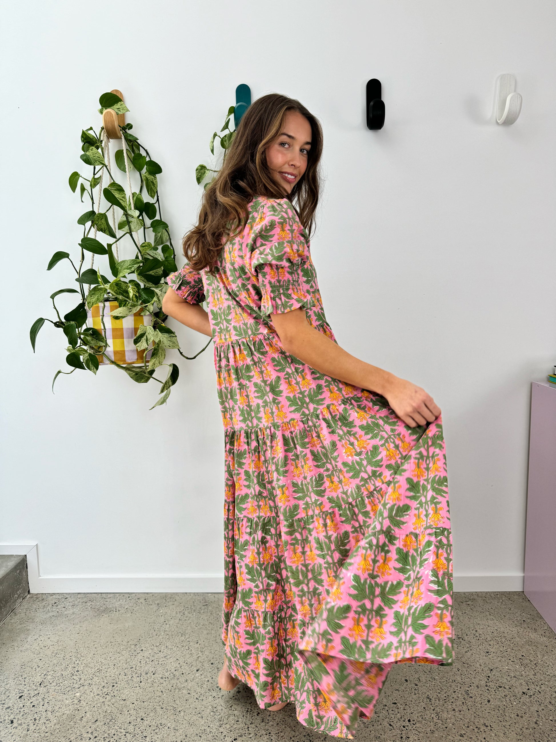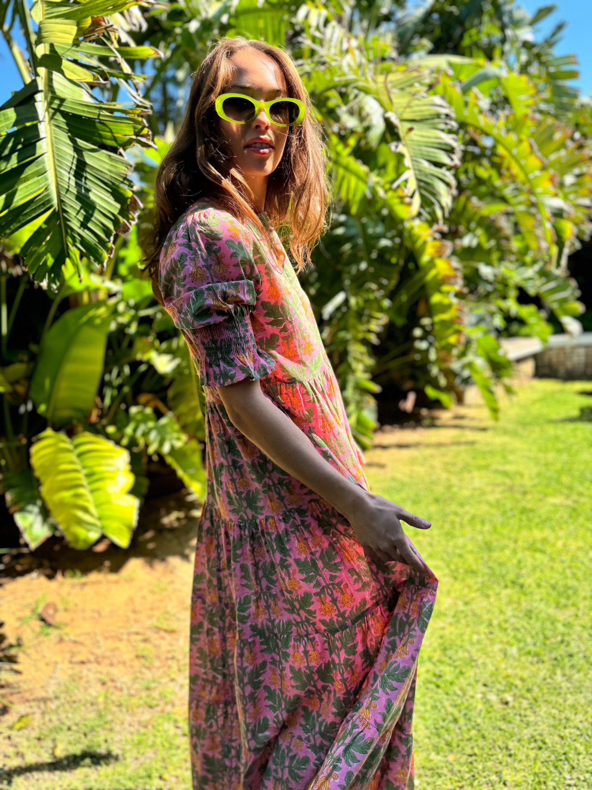 Beautiful hand block-printed cotton tiered maxi dress with button through bodice. Slightly puff sleeve with shirred cuff detail. Ethically made in India with love.