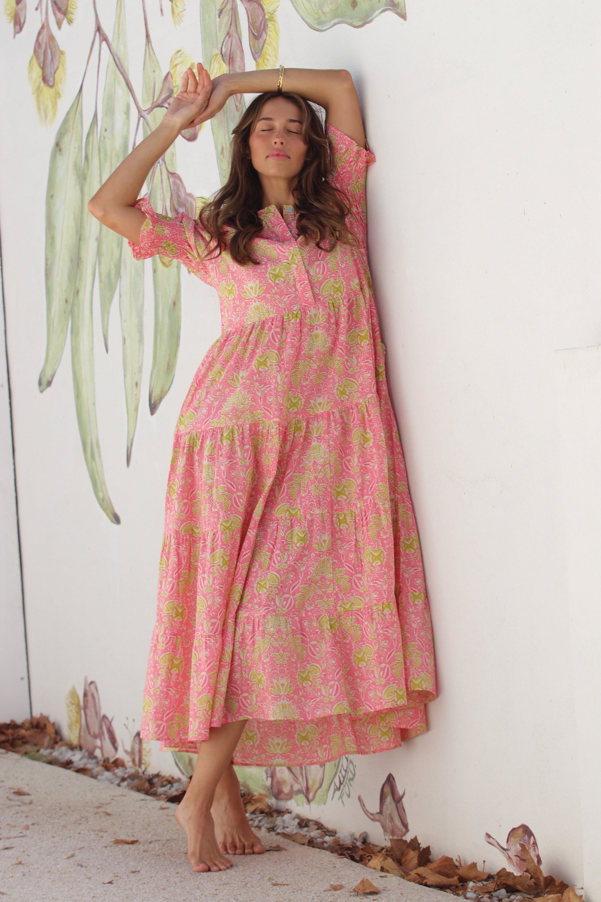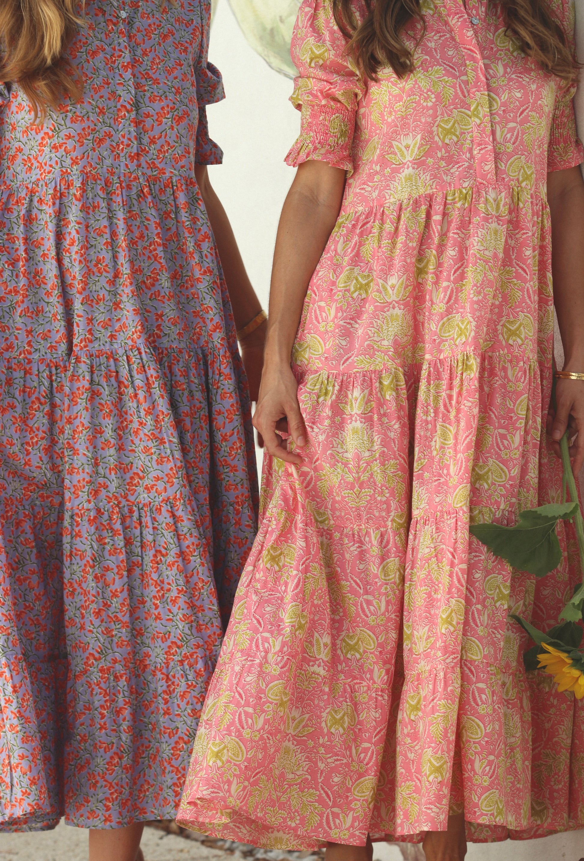 Beautiful hand block-printed cotton tiered maxi dress with button through bodice. Slightly puff sleeve with shirred cuff detail. Ethically made in India with love.