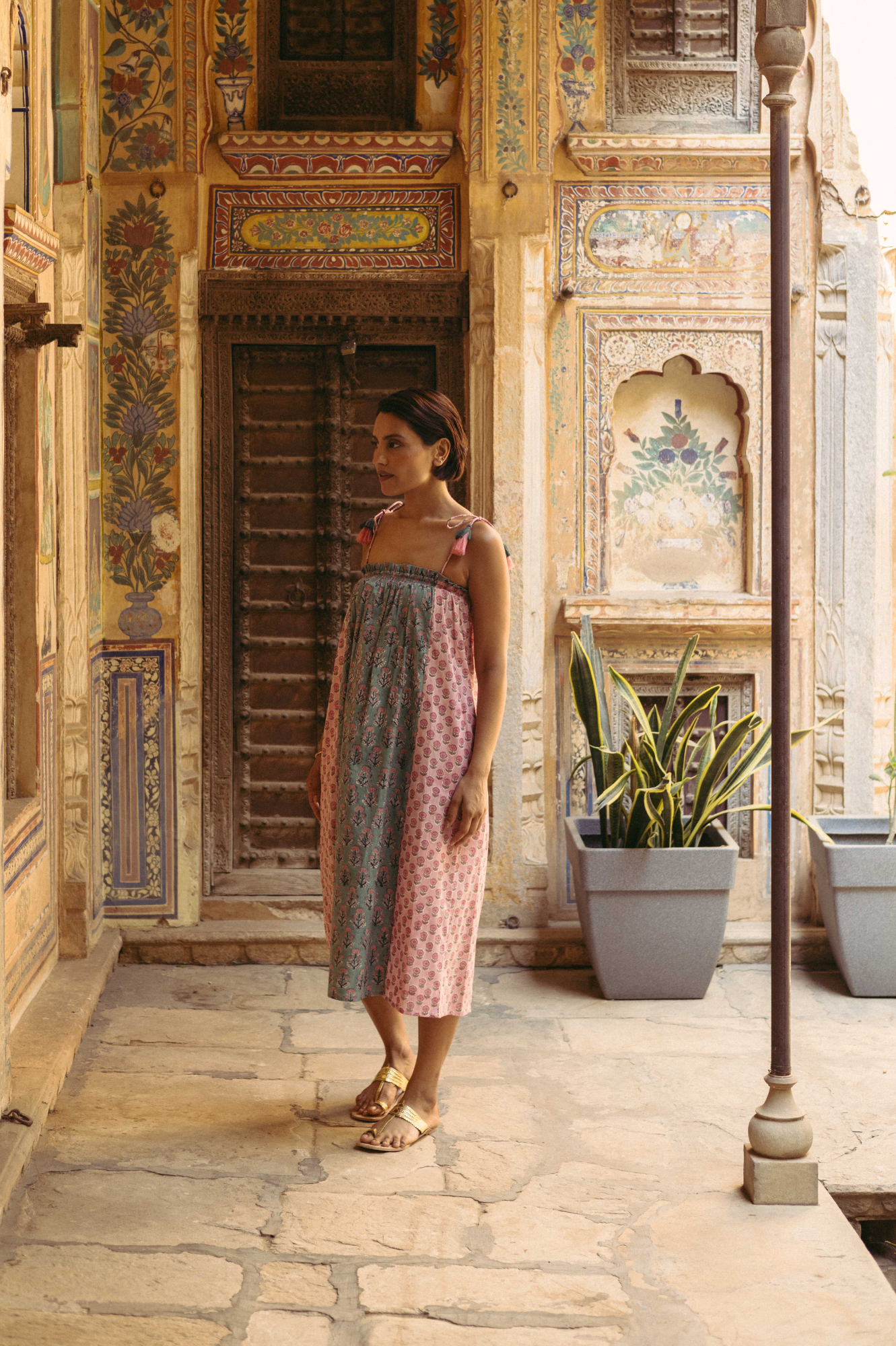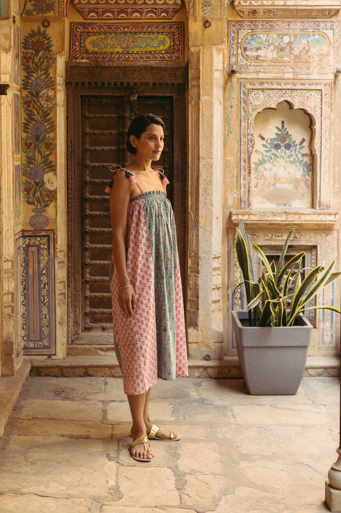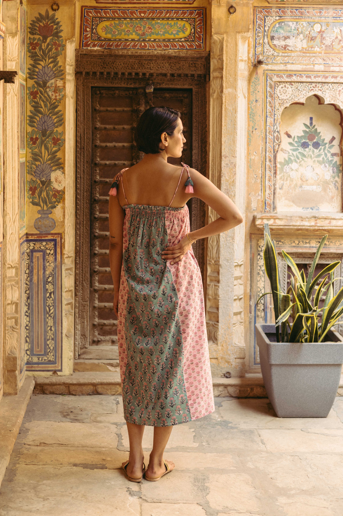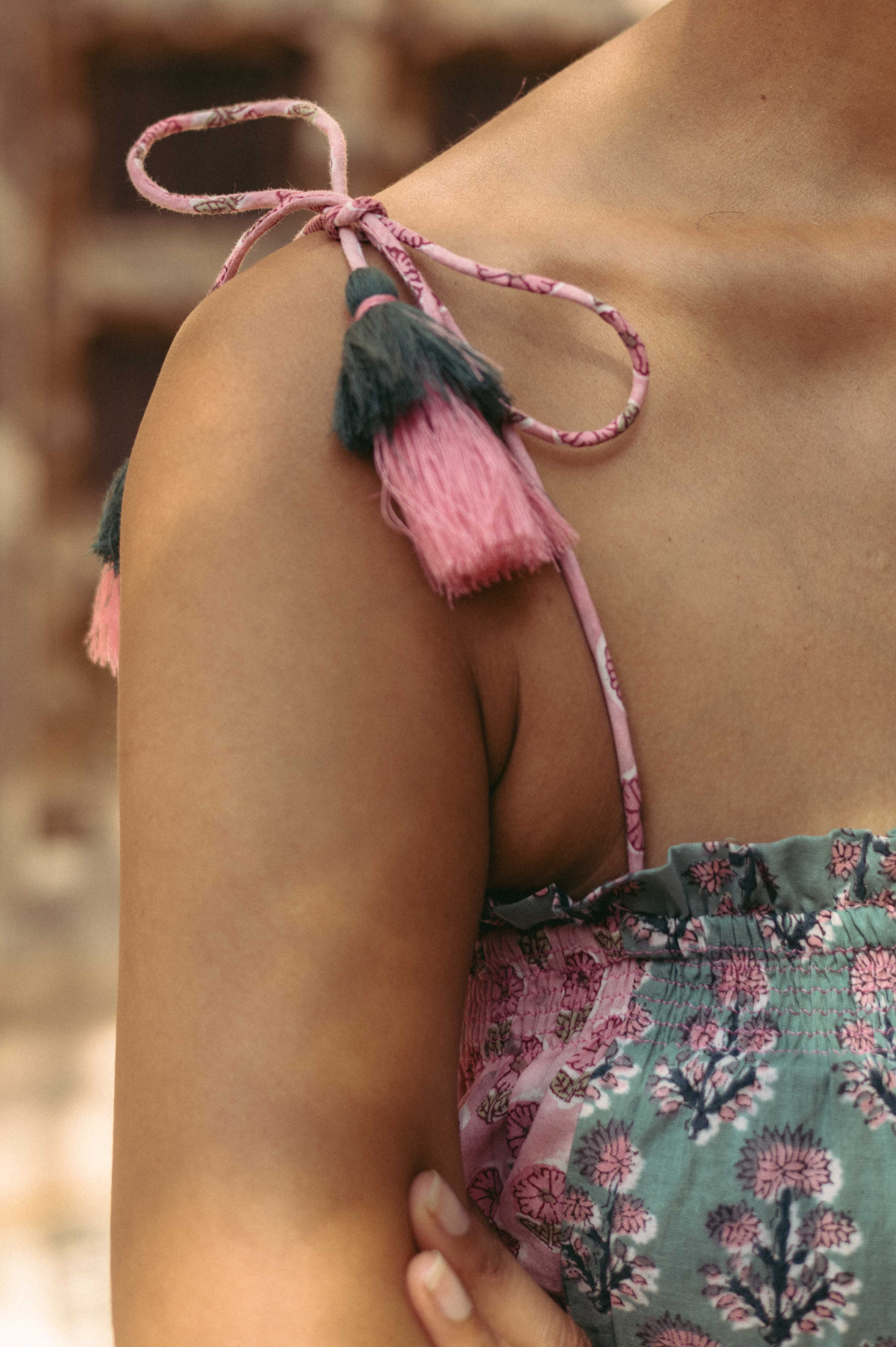 The beautiful Louisa Tassel dress features a flowing silhouette with a hand block-printed, panelled mixed print, adjustable tassel tie straps, and side pockets. It has a smocked elastic neckline with ruffled details. A perfect summer dress. Ethically made in India with love.