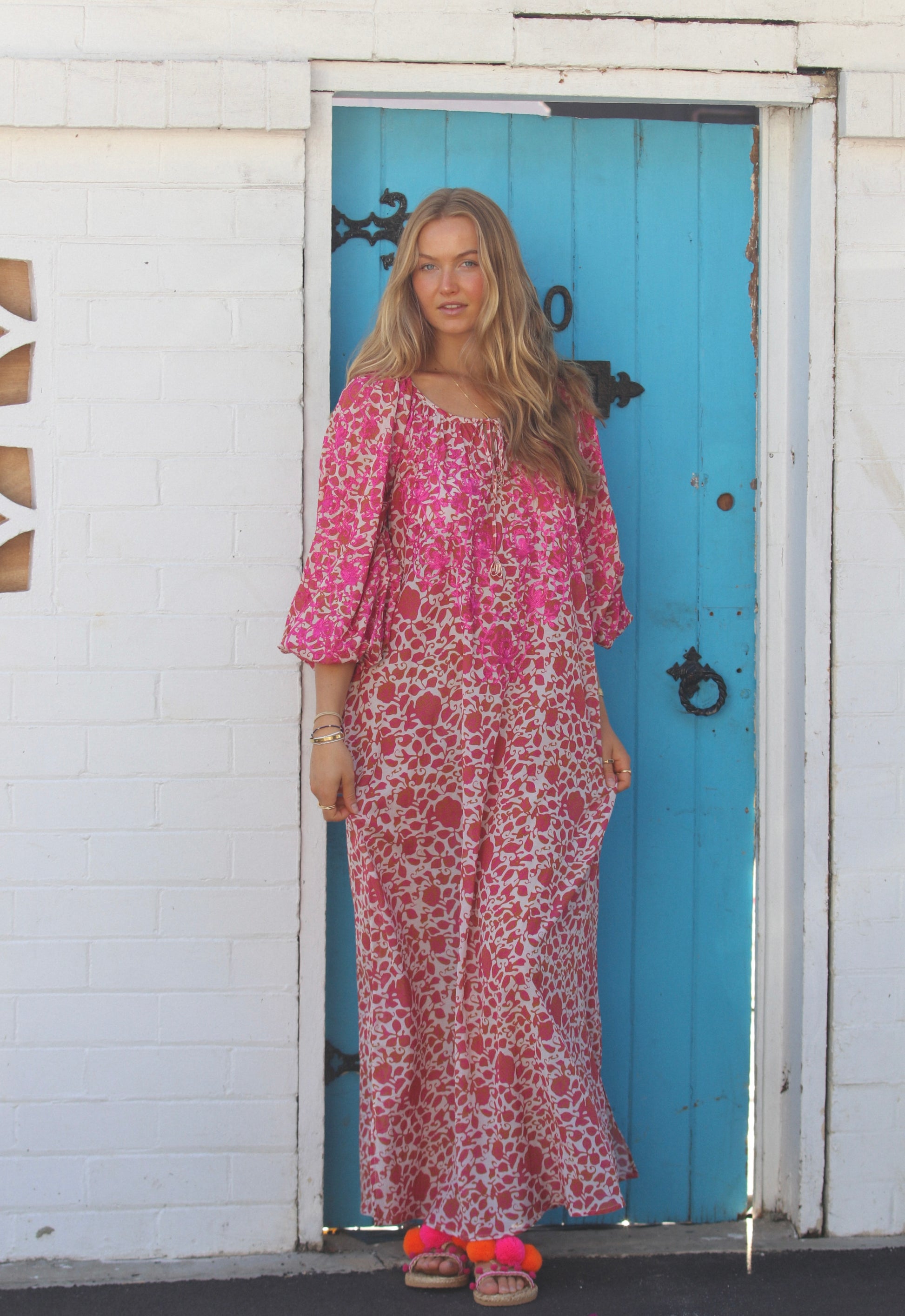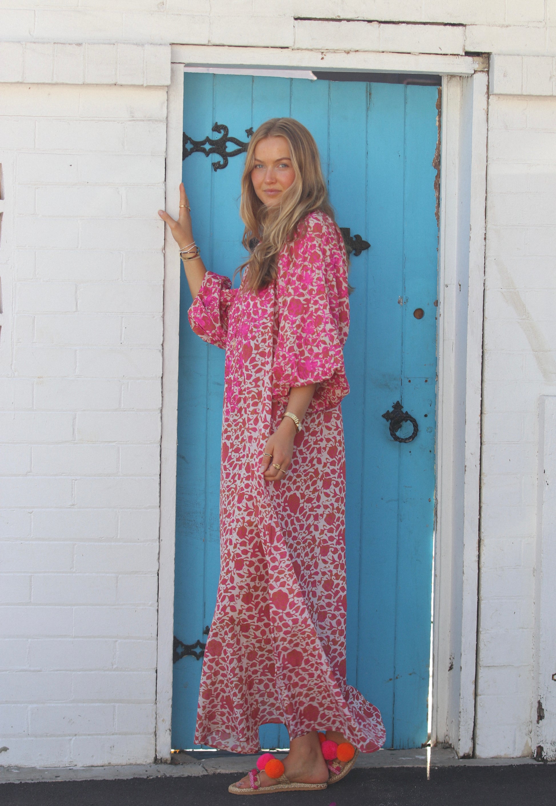 The Mandawa Kaftan – this stunning hand-block printed sushi cotton voile kaftan is embroidered with intricate floral designs. The vibrant hues of the dye are truly incredible. Designed for versatility, the kaftan features a generous, fluid drape, side slits, a round adjustable neckline, maxi length with beaded tie detail, and a tie belt, allowing you to style it your way.