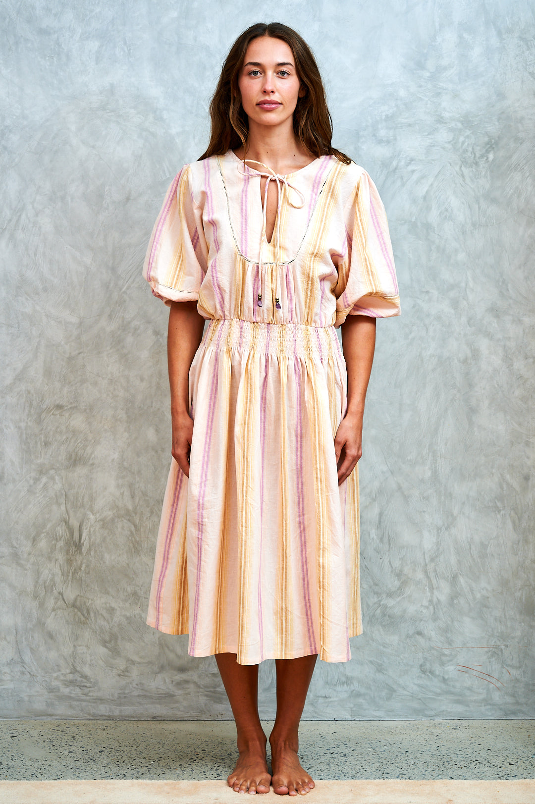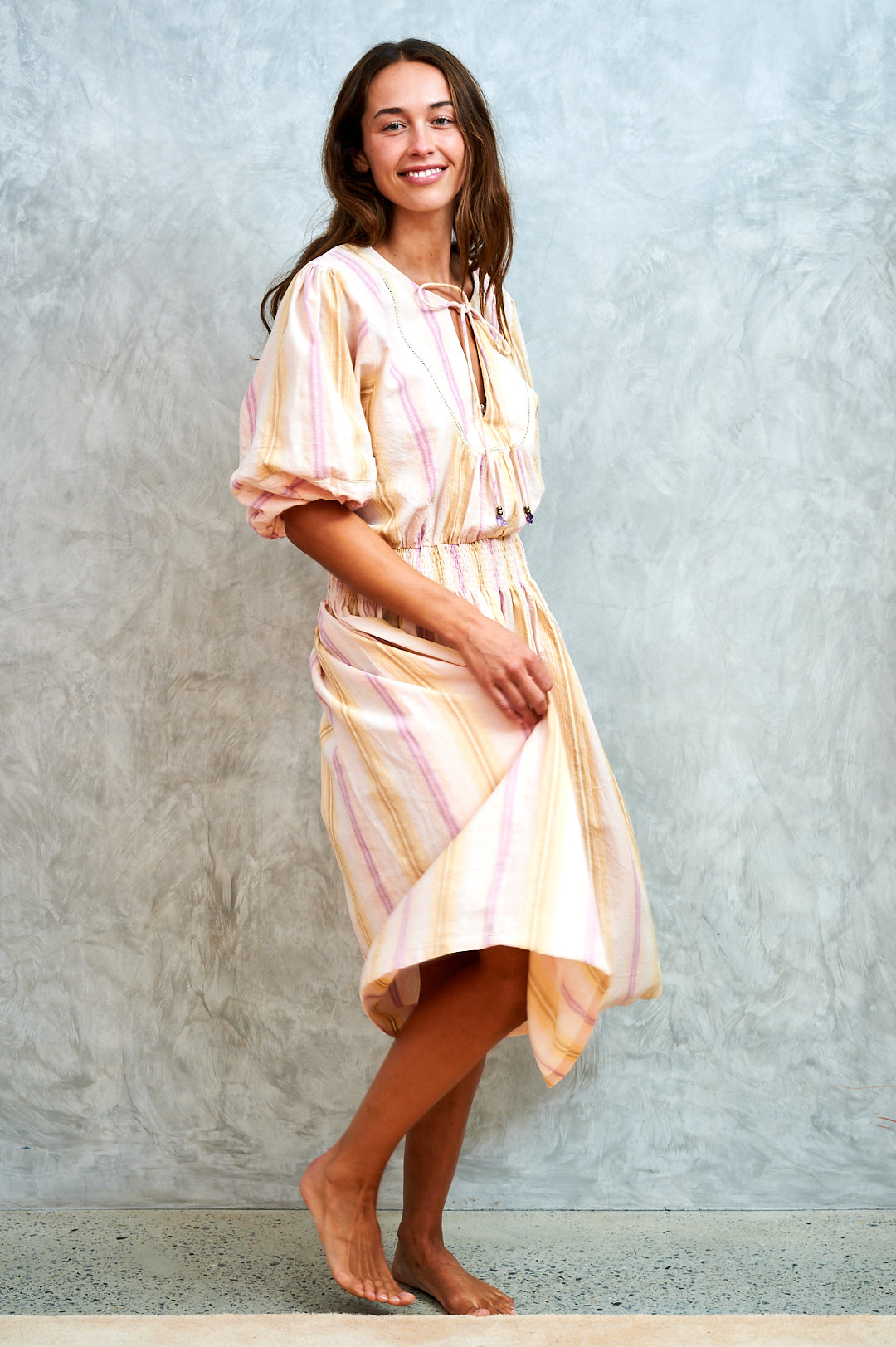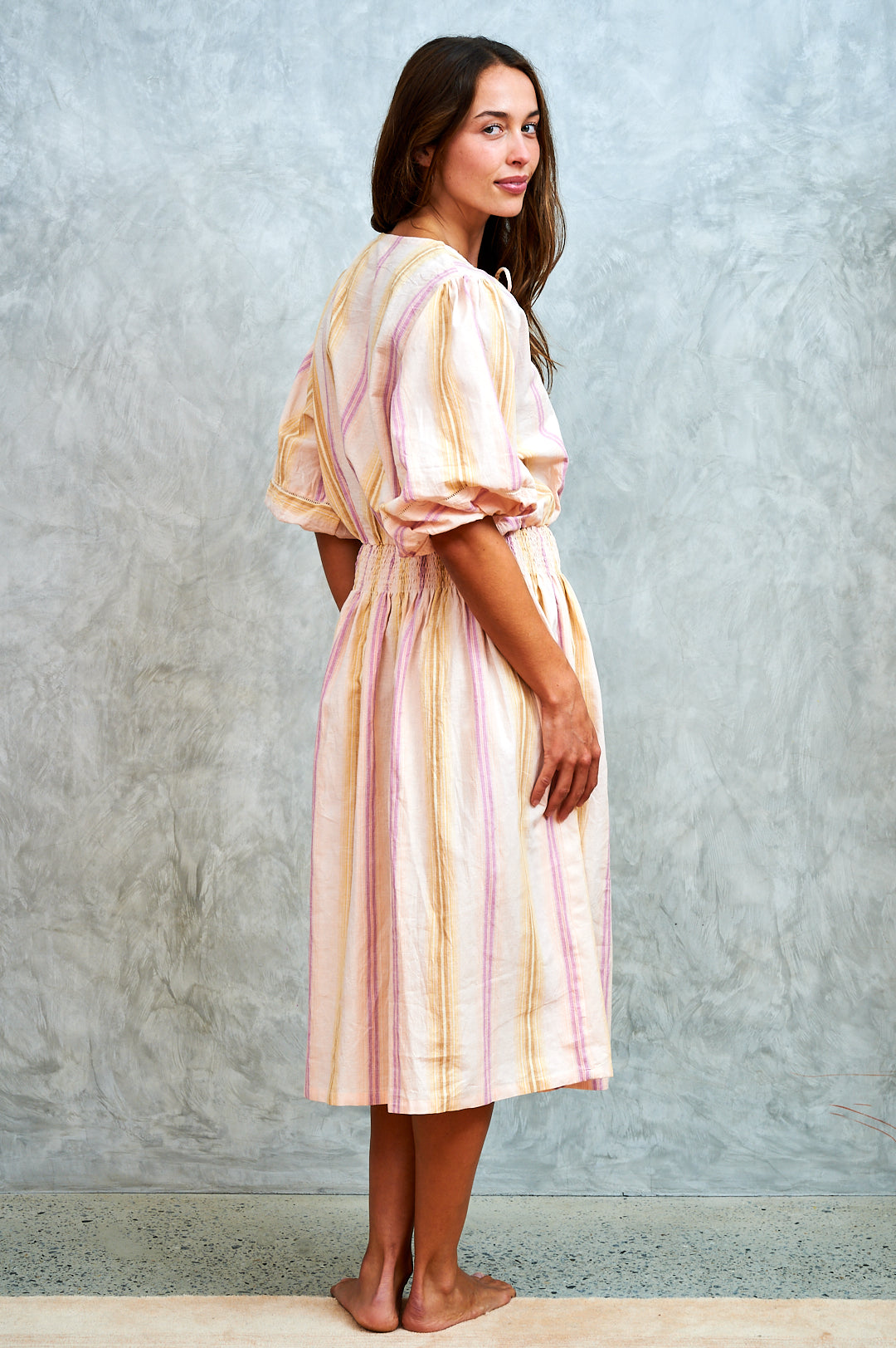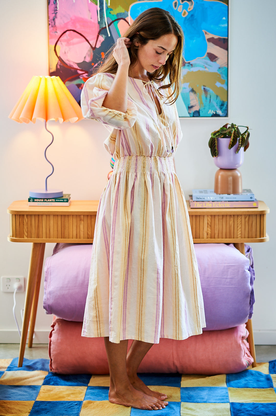 The Maya Dress is a beautifully simple, yet sculptural piece, made from soft cotton poplin. With a flattering, easy fit and a gently elasticated waist, it offers a relaxed silhouette. The dress features sculptural balloon sleeves and falls effortlessly to a midi length. Finished with long ties and delicate amethyst toggles.