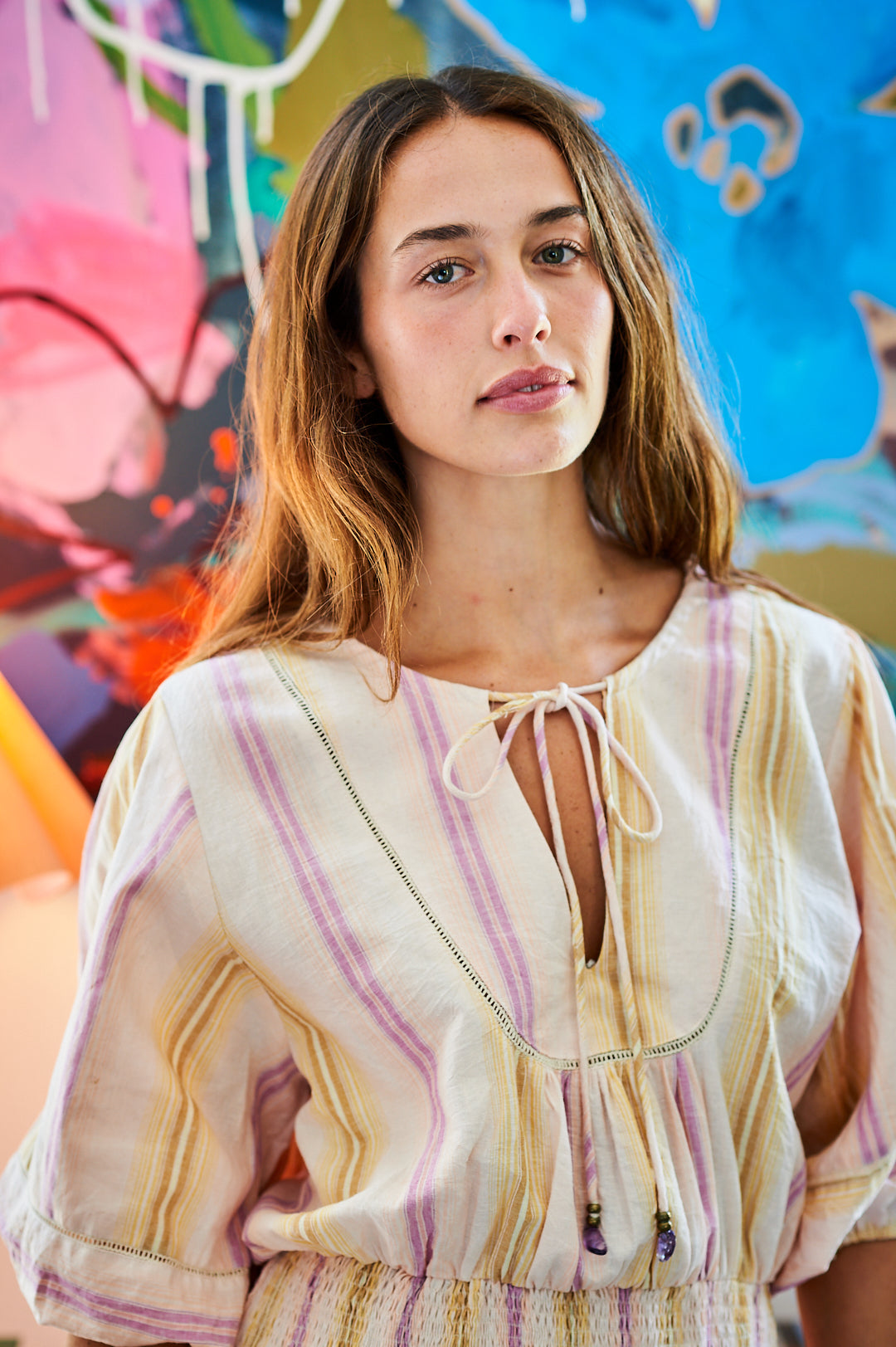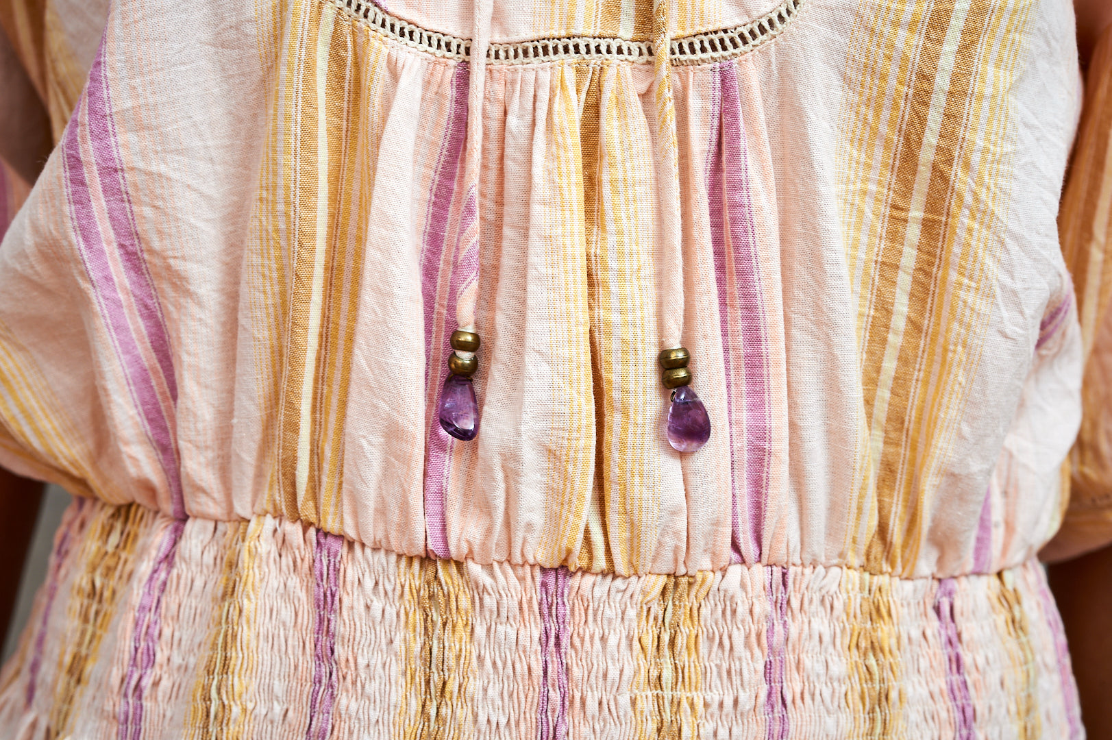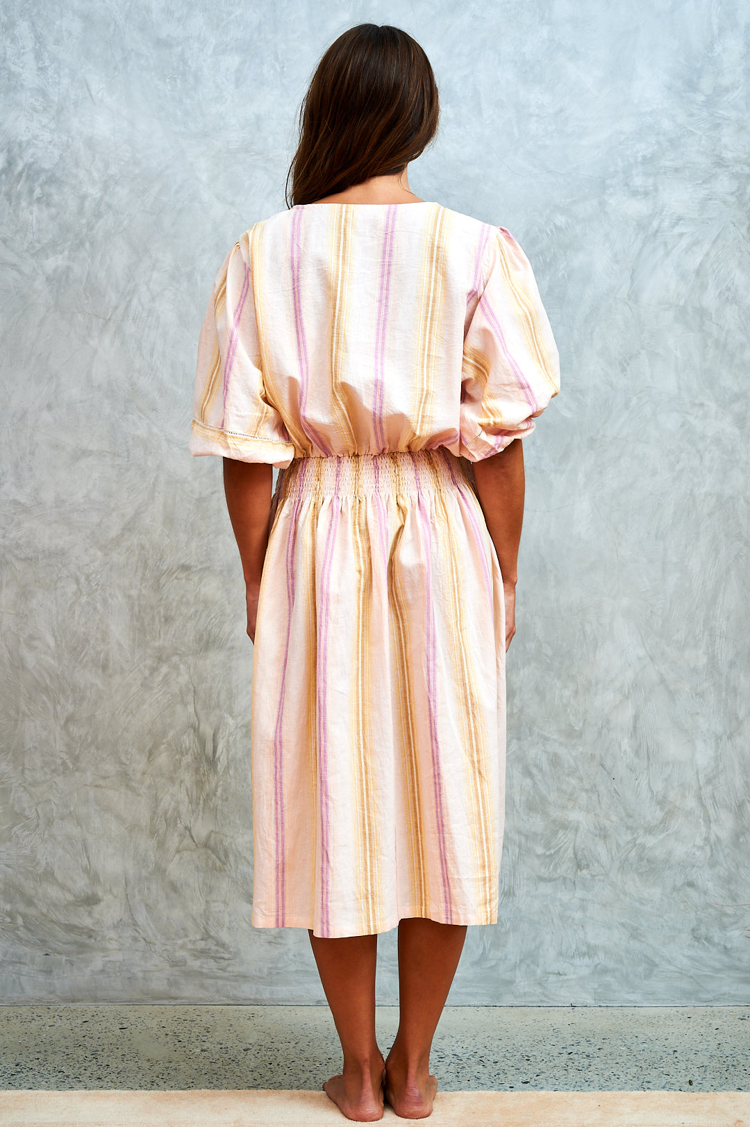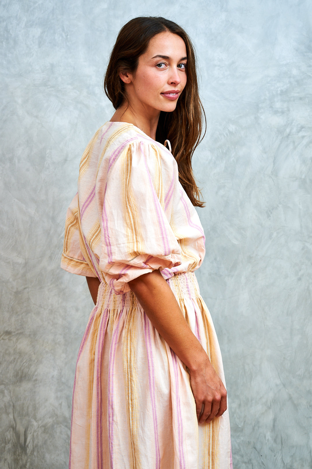 The Maya Dress is a beautifully simple, yet sculptural piece, made from soft cotton poplin. With a flattering, easy fit and a gently elasticated waist, it offers a relaxed silhouette. The dress features sculptural balloon sleeves and falls effortlessly to a midi length. Finished with long ties and delicate amethyst toggles.