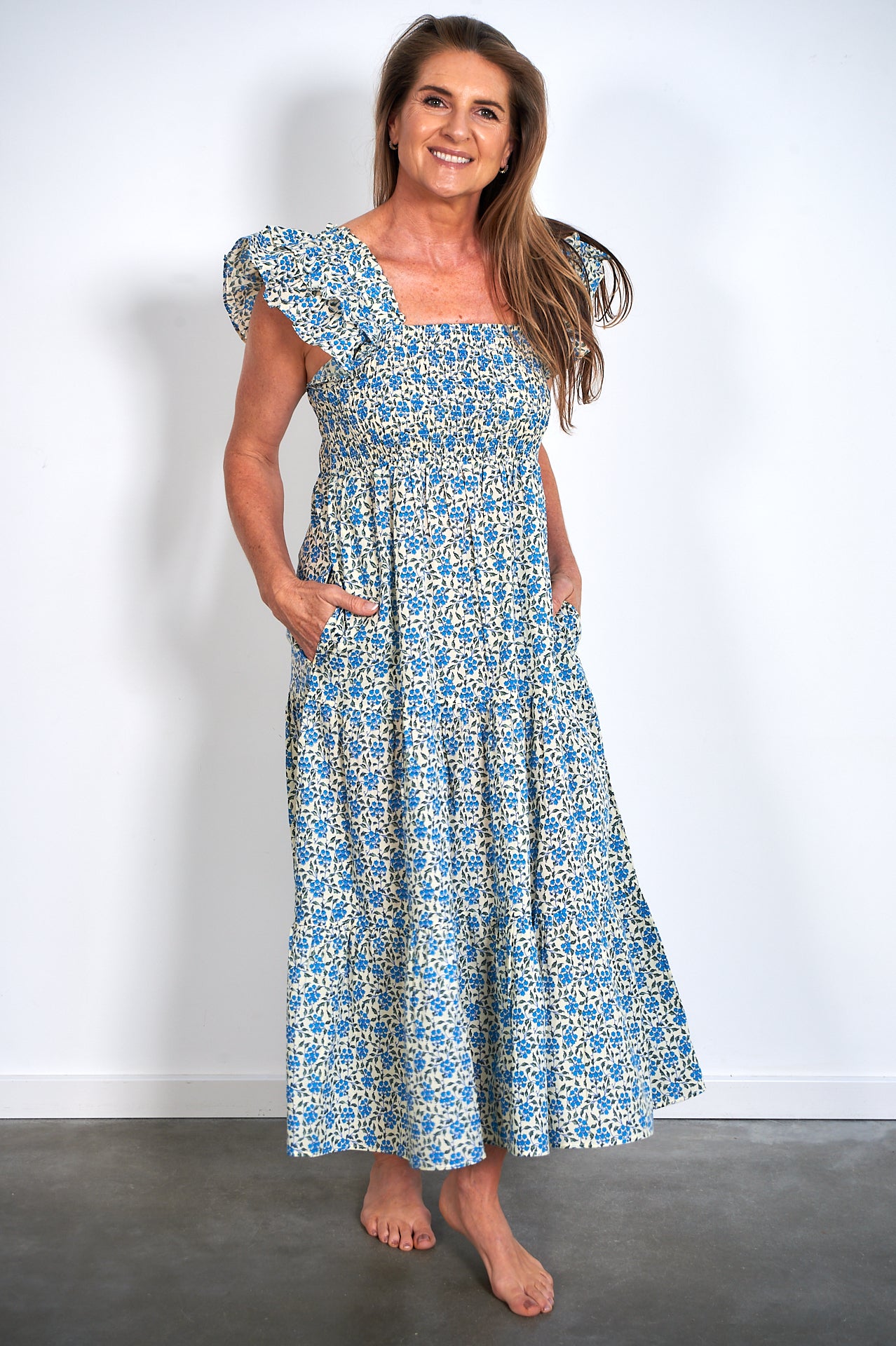 Light, floaty and fun. Hand block-printed in soft blue florals on cream cotton, with flutter sleeves, a comfy smocked bodice, and a tiered skirt with side pockets. Dress her up with a belt and wedges for long lunches, or down with flip flops for school runs and sunshine strolls — she’s as effortless as she is statement pretty.