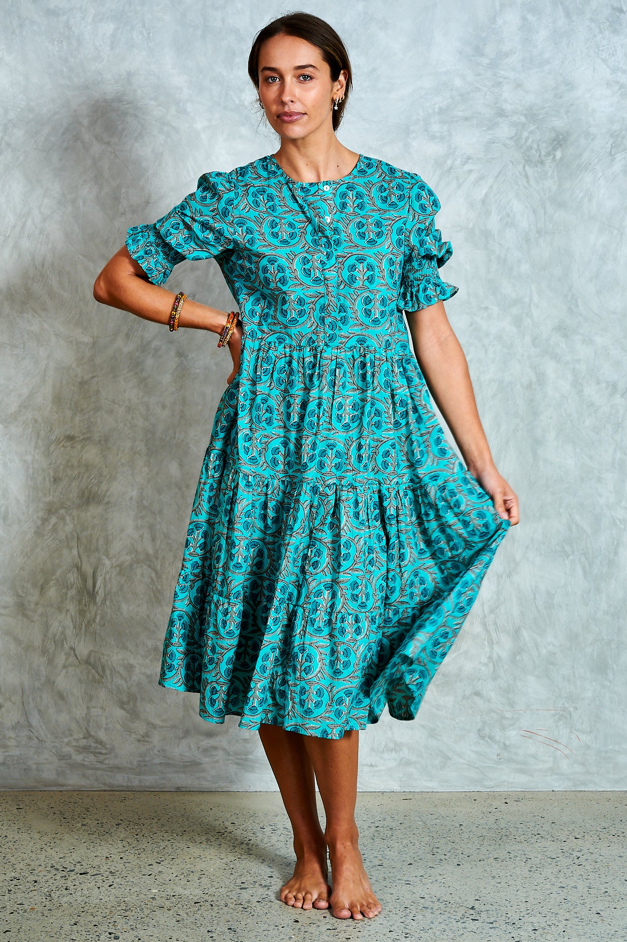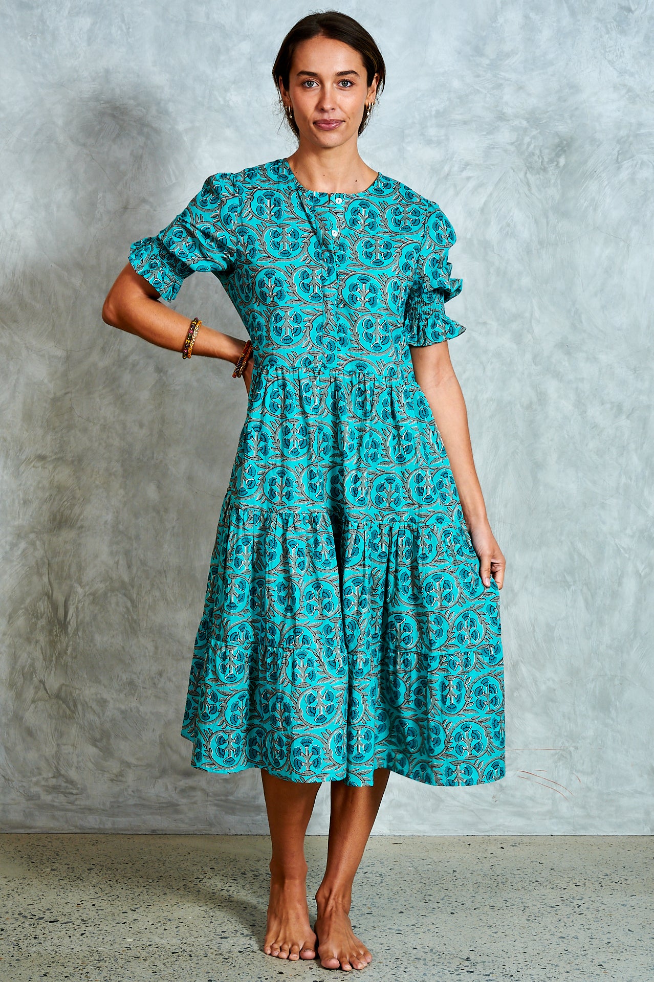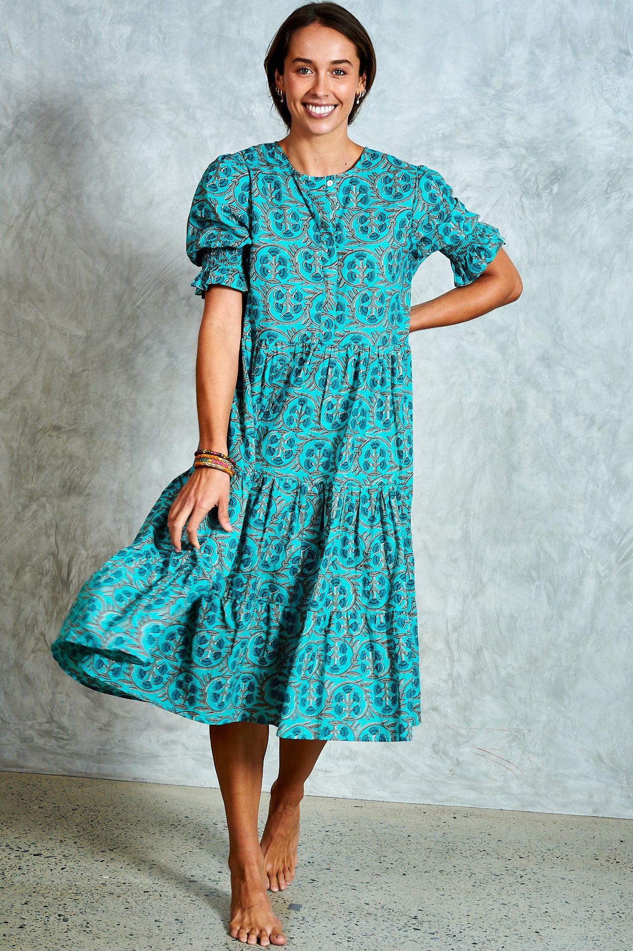 By popular demand, the much-loved Harriet now comes in a midi—meet Molly. A stunning hand block-printed cotton dress with a button-through bodice, tiered skirt, and softly puffed sleeves with shirred cuffs. Effortlessly versatile, Molly is perfect for everyday wear and easy to dress up for an evening out. Ethically made in India with love.