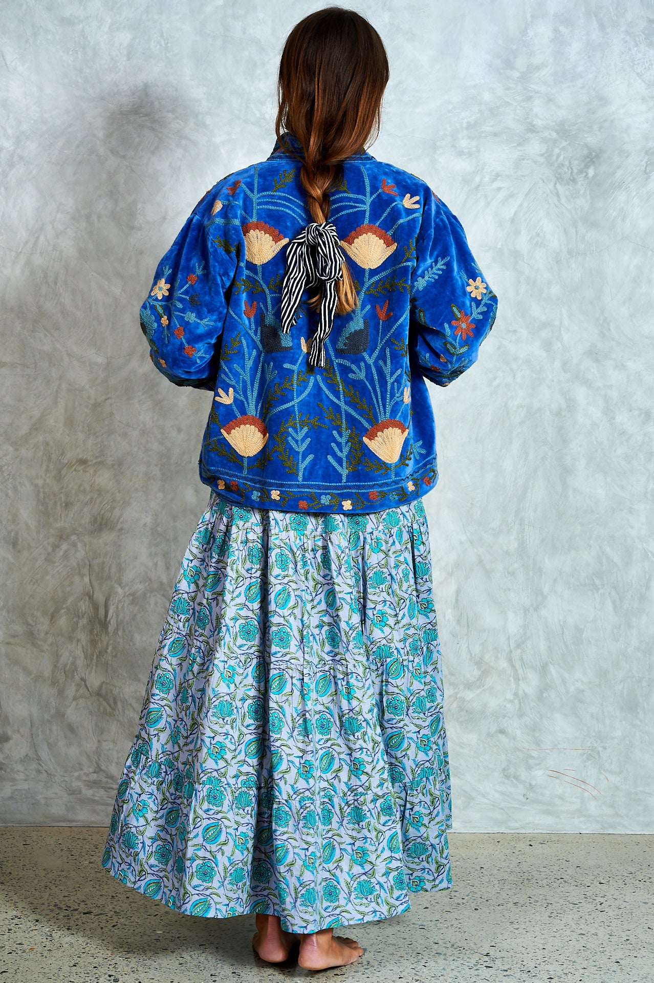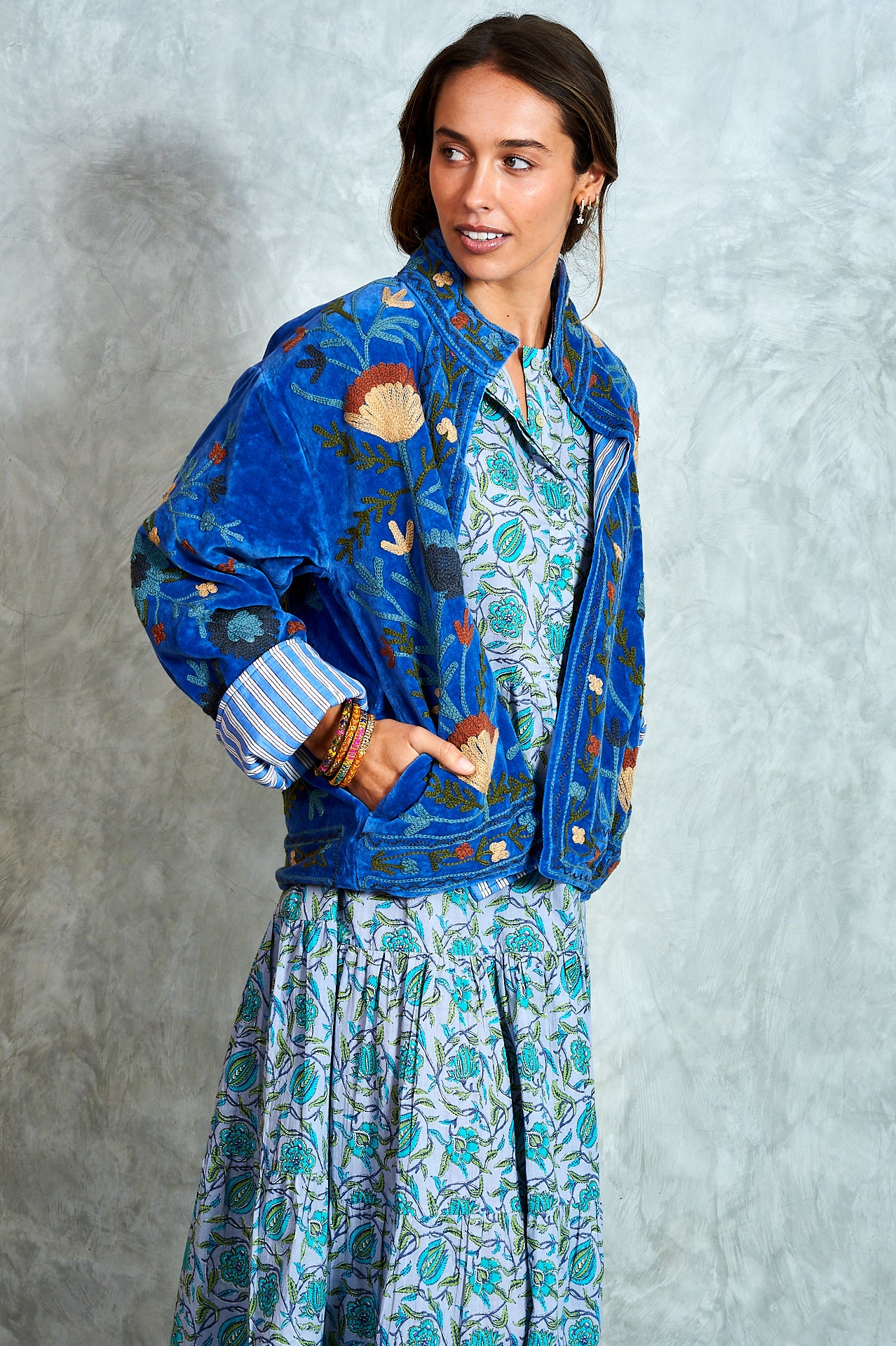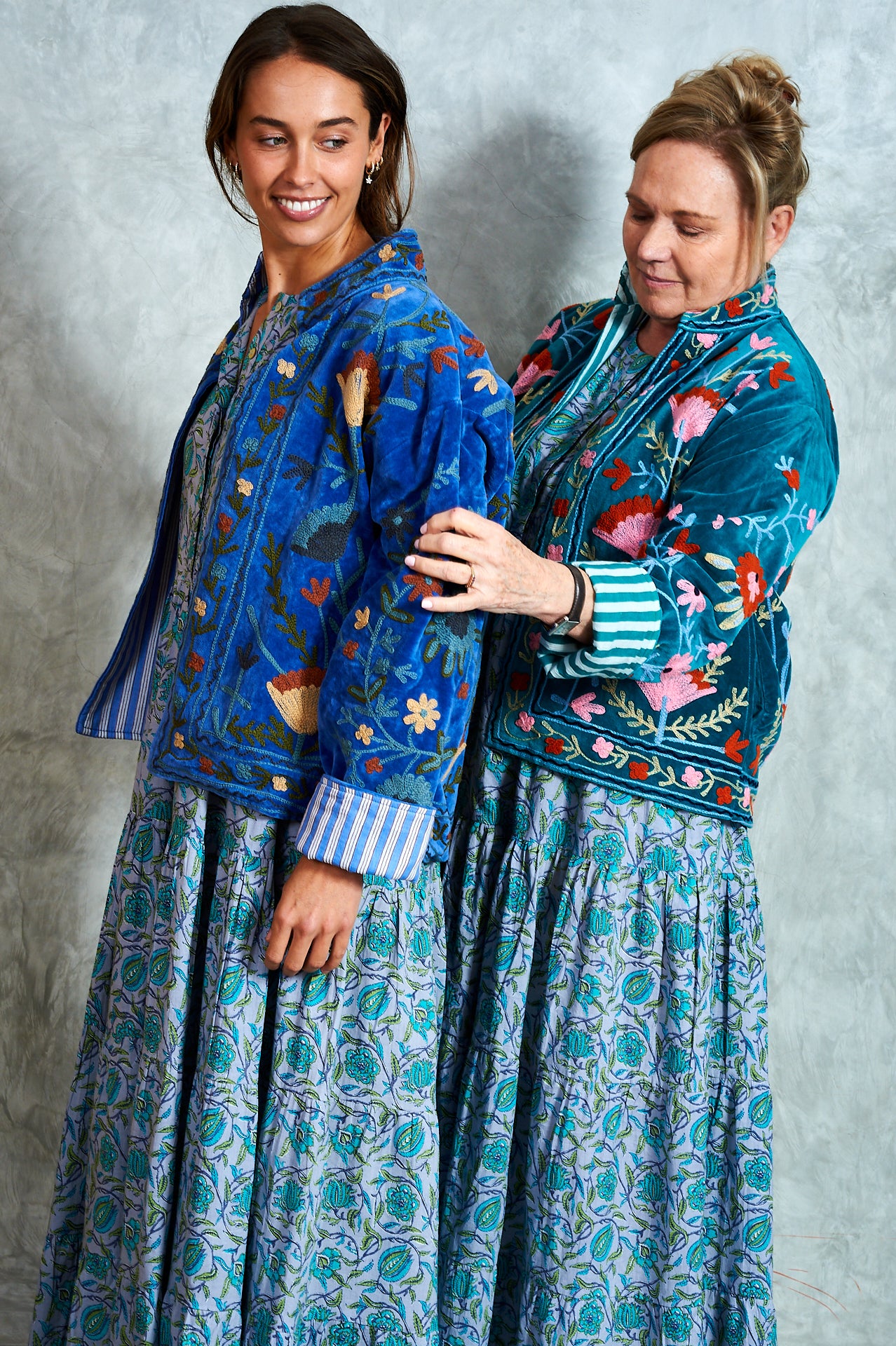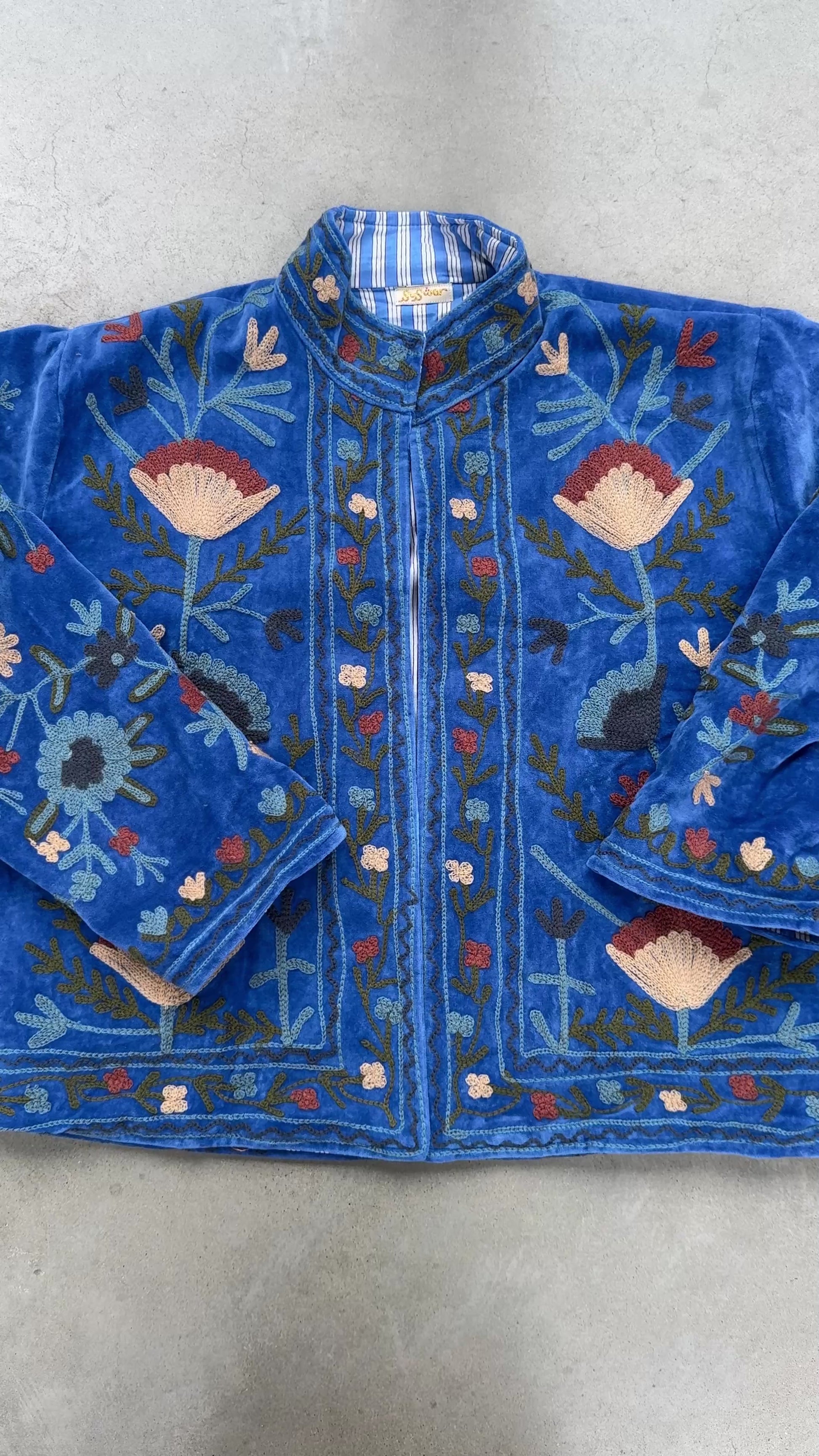 Made from plush velvet and hand-embroidered with traditional Susani detailing, this piece is a beautiful celebration of artisan skill, colour, and texture. Throw it over a flowing dress for effortless bohemian glamour, or pair it with jeans and boots for an elevated everyday look.