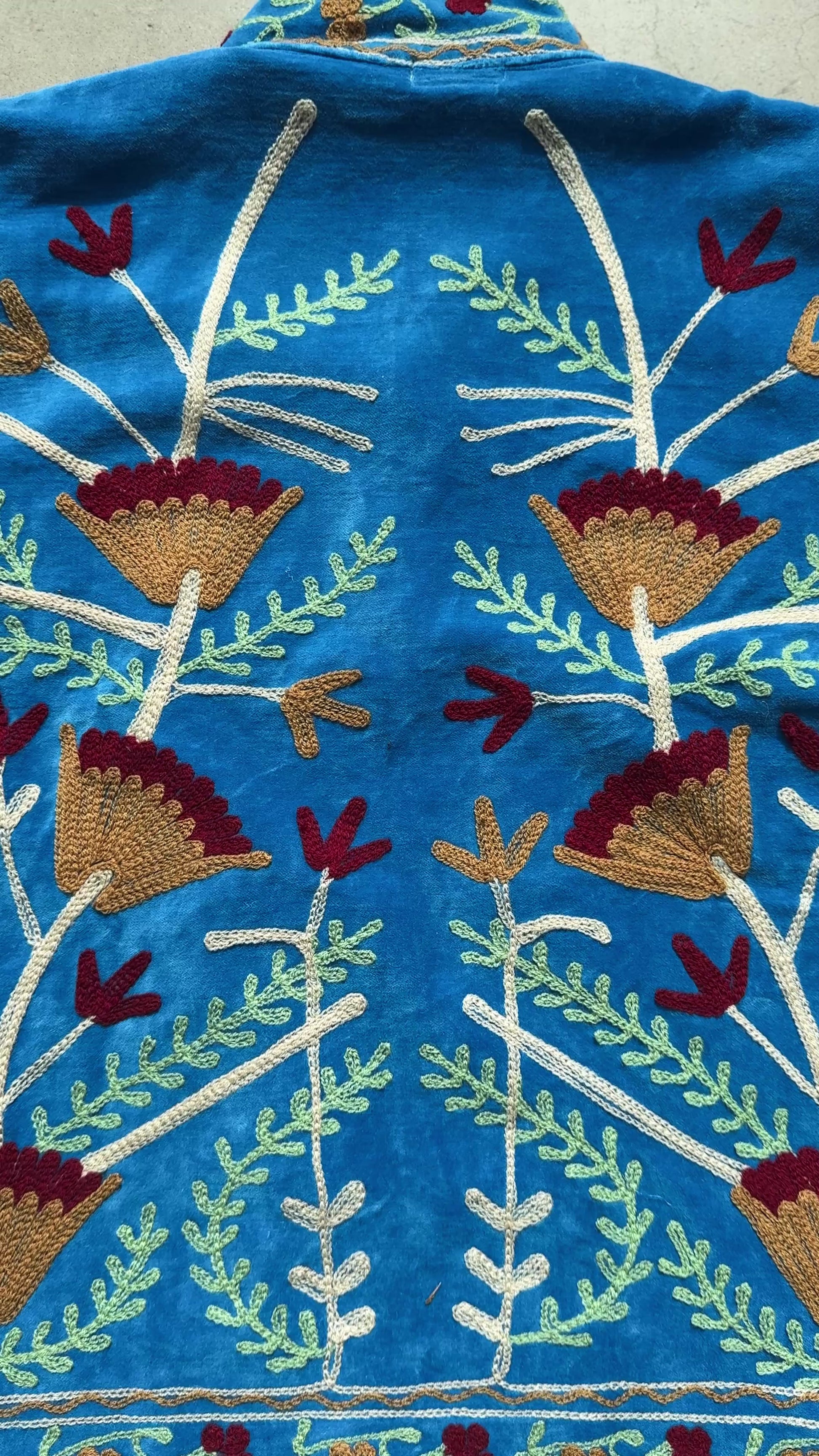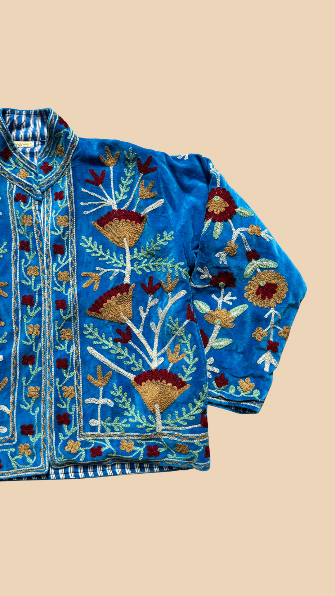 Made from plush velvet and hand-embroidered with traditional Susani detailing, this piece is a beautiful celebration of artisan skill, colour, and texture. Throw it over a flowing dress for effortless bohemian glamour, or pair it with jeans and boots for an elevated everyday look.