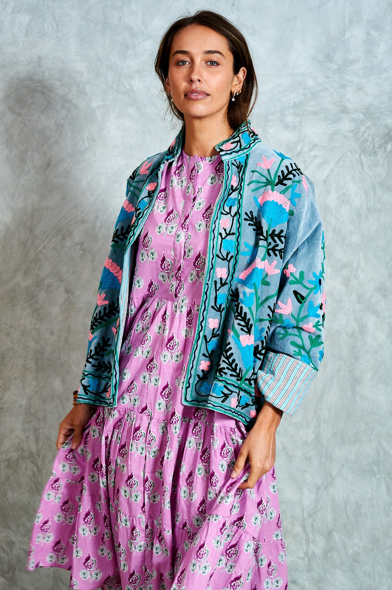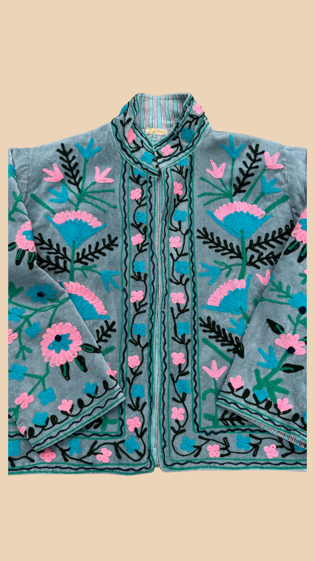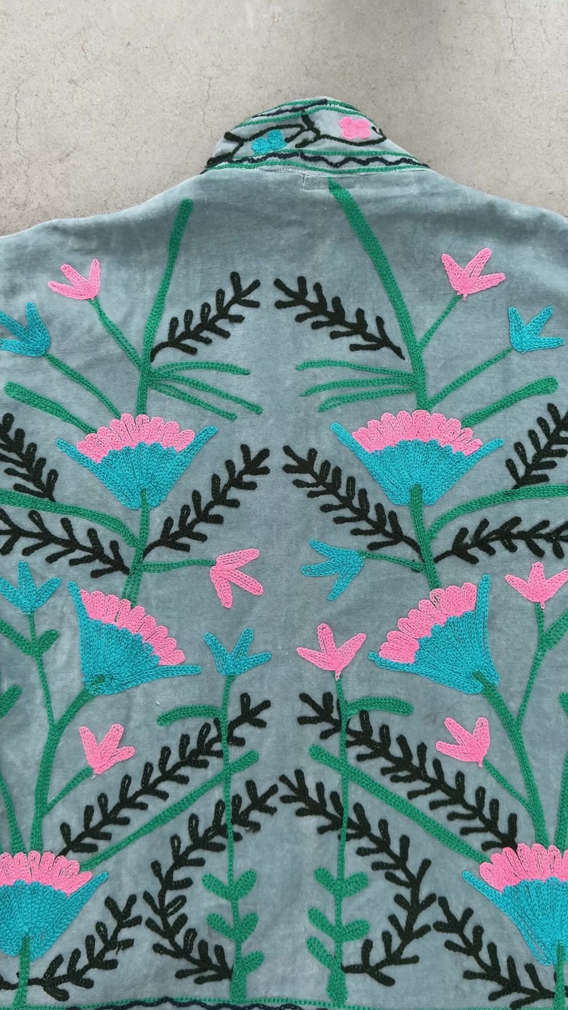 Made from plush velvet and hand-embroidered with traditional Susani detailing, this piece is a beautiful celebration of artisan skill, colour, and texture. Throw it over a flowing dress for effortless bohemian glamour, or pair it with jeans and boots for an elevated everyday look.