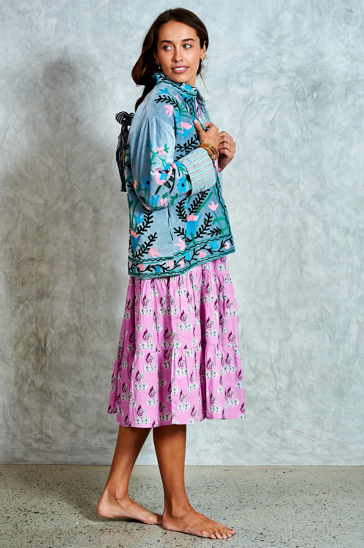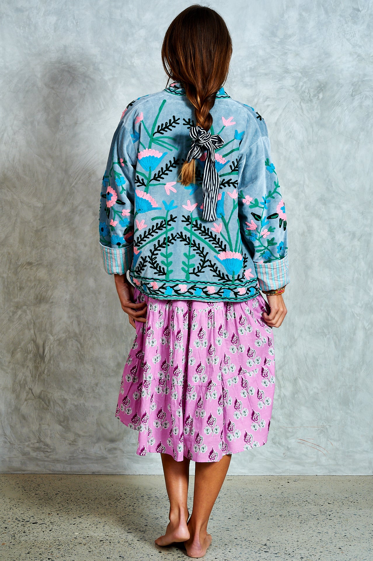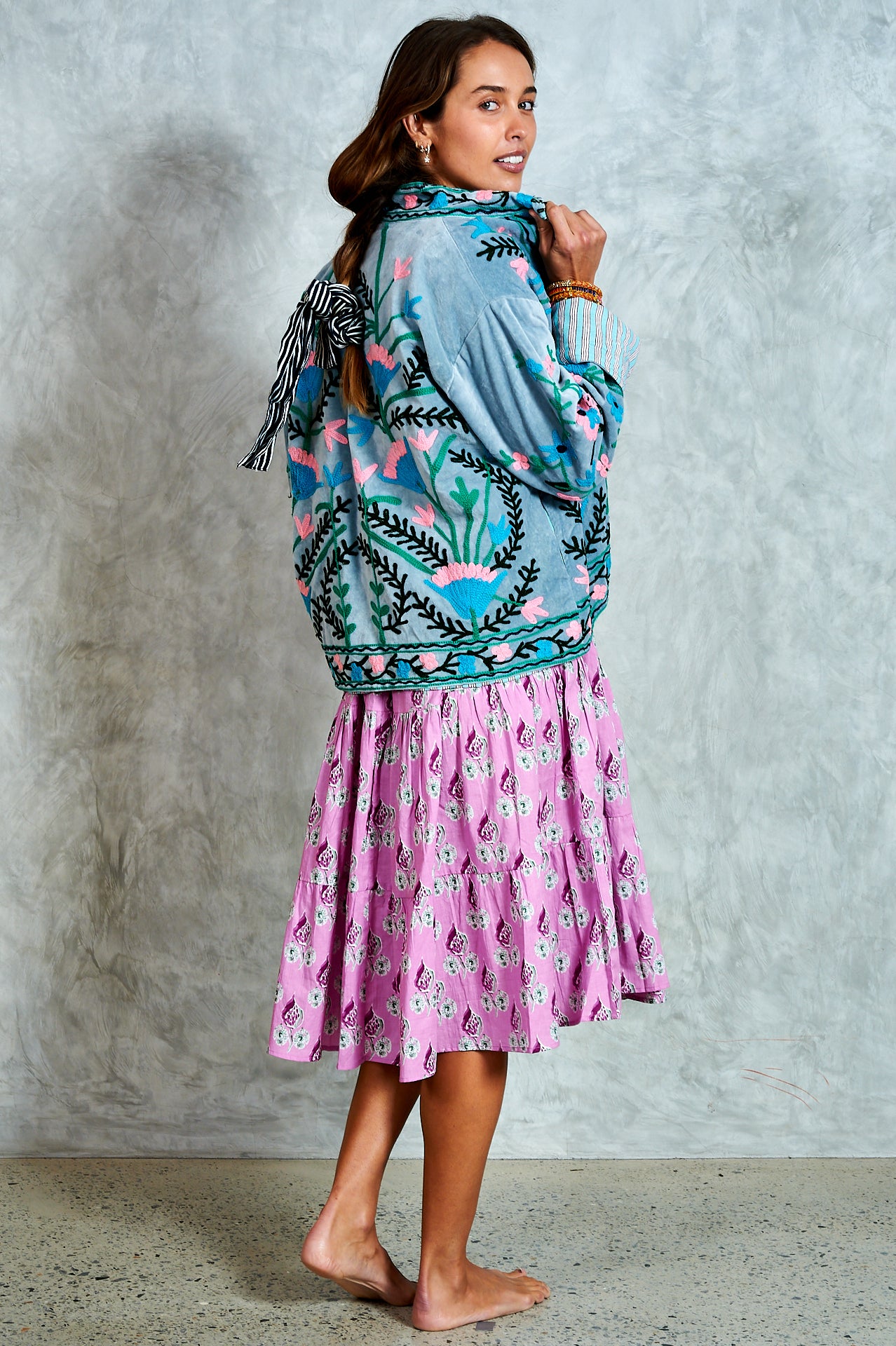 Made from plush velvet and hand-embroidered with traditional Susani detailing, this piece is a beautiful celebration of artisan skill, colour, and texture. Throw it over a flowing dress for effortless bohemian glamour, or pair it with jeans and boots for an elevated everyday look.